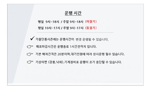 - 성수기 기간 케이블카 운영시간 : 오전 8시~ 오후 5시