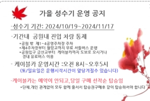 - 2024년 가을 단풍 성수기 : 오전 8시~ 오후 5시